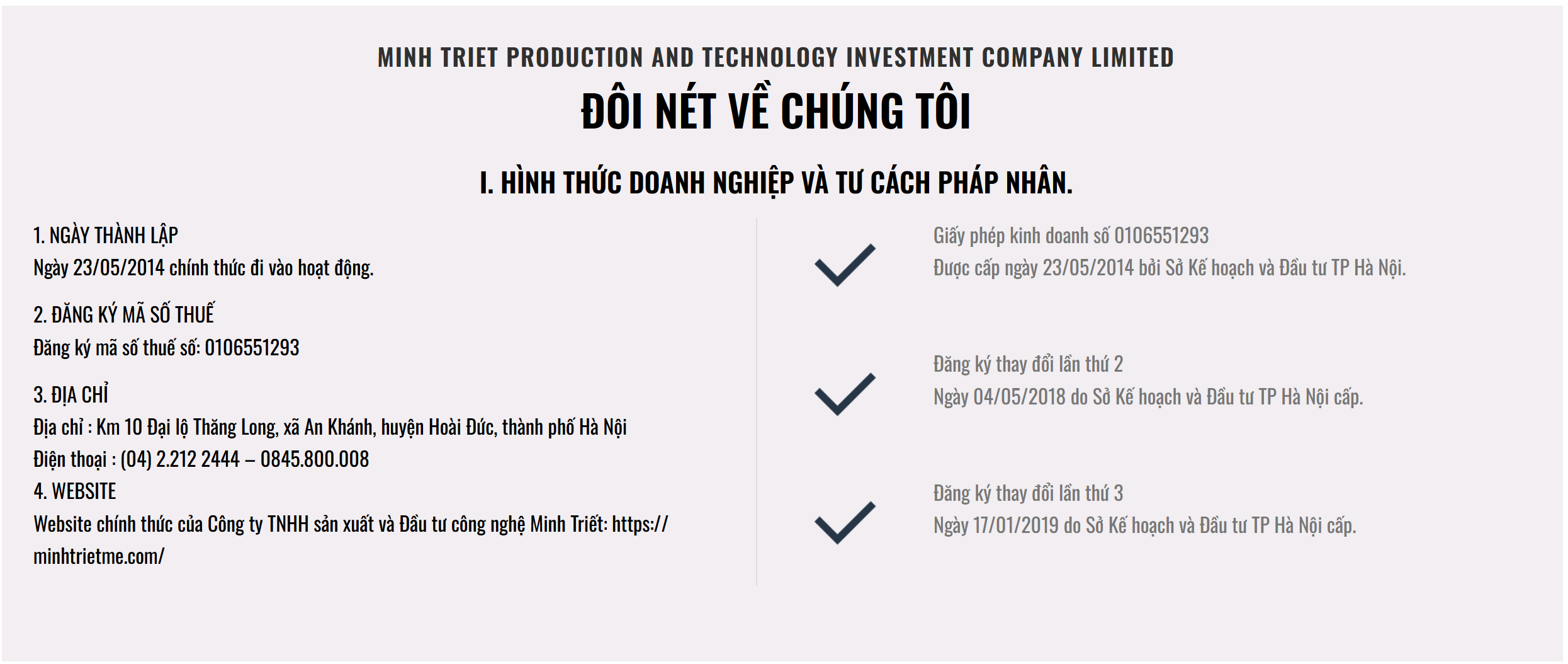 Lời đầu tiên, tôi xin thay mặt Công ty TNHH Sản xuất và Đầu tư Công nghệ Minh Triết gửi tới Quý khách lời chào trân trọng cùng lời chúc sức khỏe và thành công.